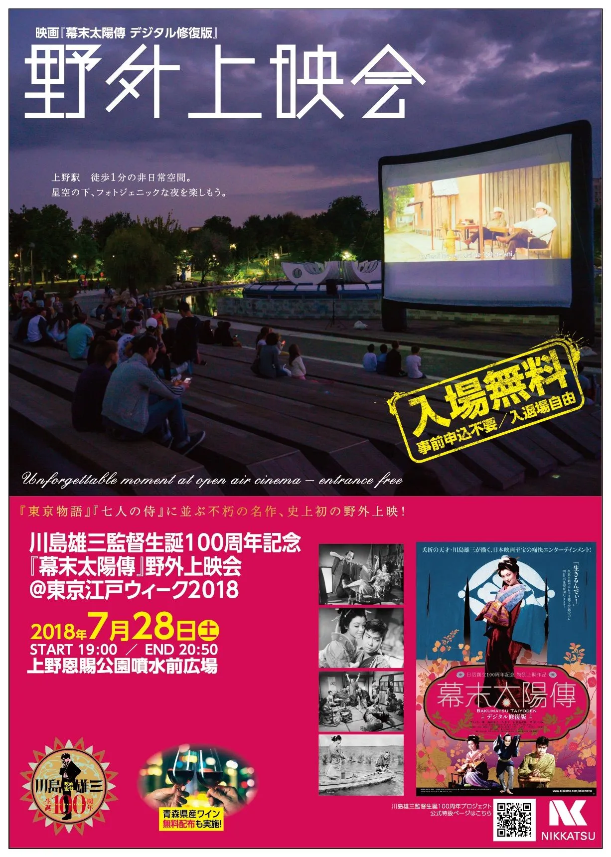 7月28日(土)は、「江戸」をテーマに“日本文化”を世界中へ発信するイベント「東京江戸ウィーク2018」のなかで、映画会社 日活が展開している「川島雄三監督生誕100周年プロジェクト」の一環として、日本映画史に残る江戸を舞台にした川島監督作品「幕末太陽傳」の野外上映会が行われます。同日18時より、その上映会と「ミッドナイト寄席」がコラボし、若手人気落語家による公開収録イベントを実施!入場無料のイベントですので、お気軽にご参加ください。