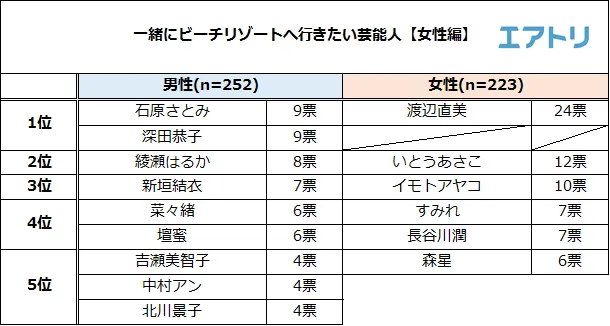 一緒にビーチリゾートへ行きたい女性芸能人を聞いたところ、男性が選ぶ1位は「石原さとみ」と「深田恭子」が同票(9票)で並び、2位は「綾瀬はるか」(8票)、3位は「新垣結衣」(7票)と人気女優たちがTOP3を占める結果となりました。