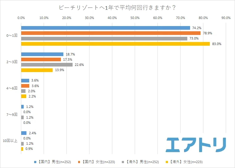 ビーチリゾートへ1年で平均何回行くか聞いたところ、最も多かったのは「0~1回」(【国内】男性:74.2%、女性:78.9%【海外】男性:73.0%、女性:83.0%)となりました。2回以上と回答する人も国内・海外ともに一定数おり、男性の約4人に1人が海外のビーチリゾートへ「2~3回」(22.6%)行くと回答し、海外のリゾートが身近なものであると感じられます。
