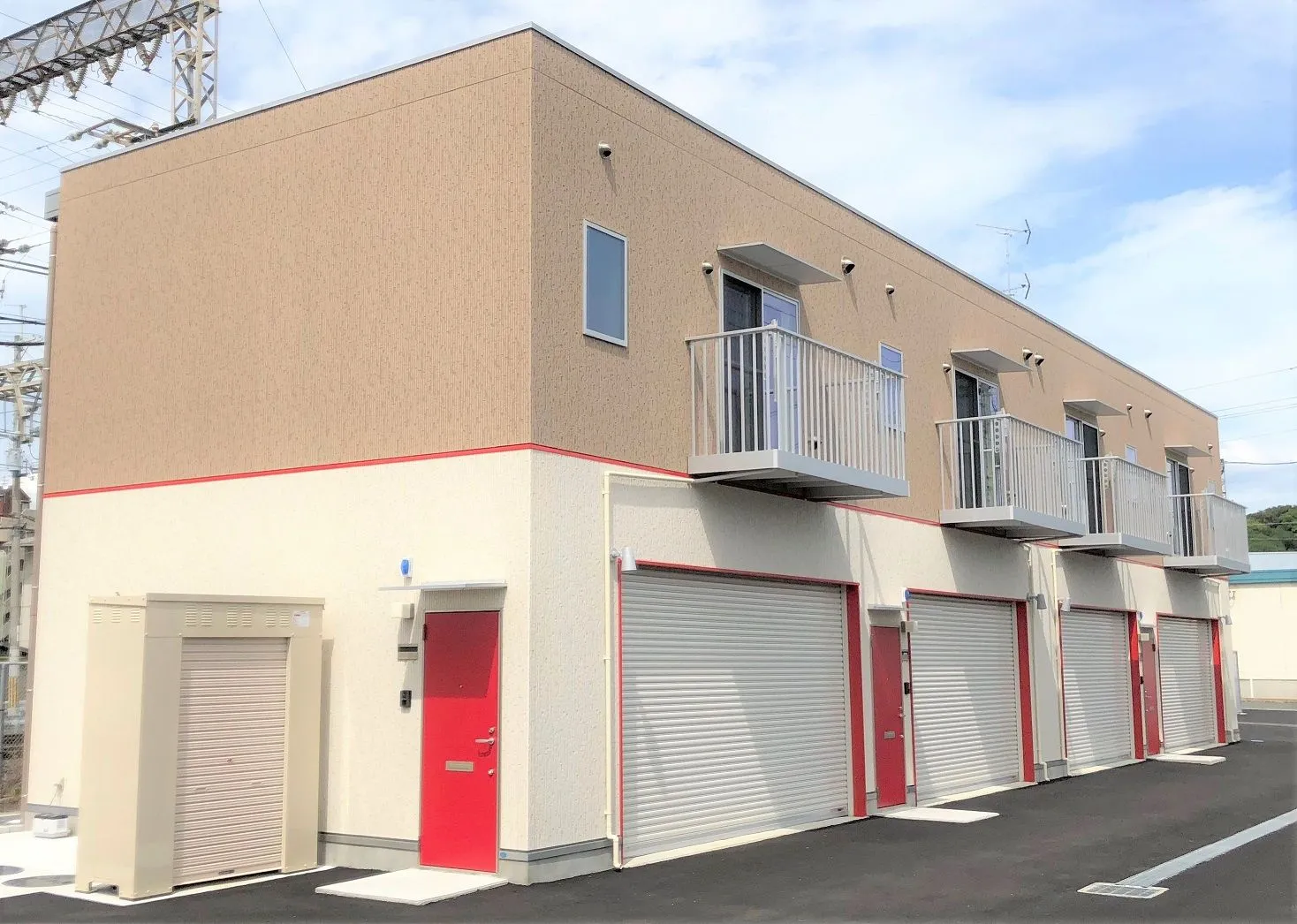 貸室は2階建てになっており、1階は本物件の最大の特長である、シャッター開口幅約4.6m×高さ約2.4mの大型ガレージスペースで、車・バイクの保管や、整備や洗車をしたり、趣味のアイテムのコレクションを保管するなど、幅広い用途にご利用できます。さらに全戸、屋外に車1台分の駐車スペースを確保しており、ガレージスペースと合わせて最大3台の車を駐車することが可能です。