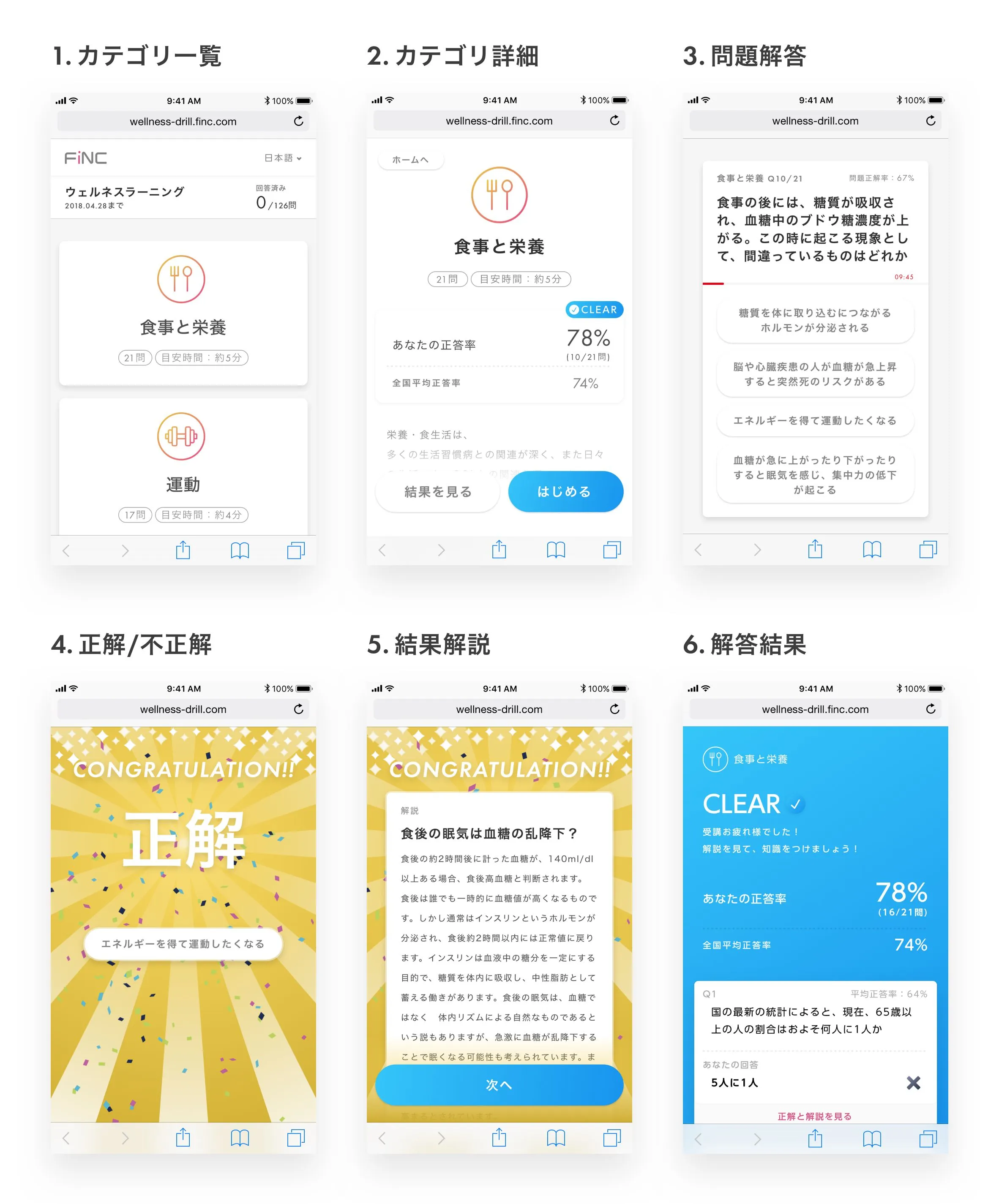 FiNCウェルネスラーニングは、FiNC for BUSINESSに新しく機能追加された「従業員のヘルスリテラシーを向上し、行動変容を促すことができるeラーニング」です。健康に役に立つ知識を楽しみながら学習し、学んだ健康知識を明日からすぐに活かすことができるように開発しています。