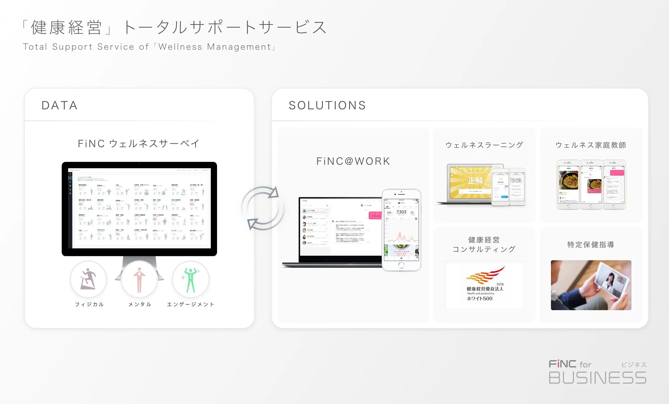 「FiNC for BUSINESS」は、健康経営のデータ&ソリューションが可能なオールインワンプラットフォームです。企業の経営資源である従業員とそのご家族の心身の健康増進をトータルサポートいたします。