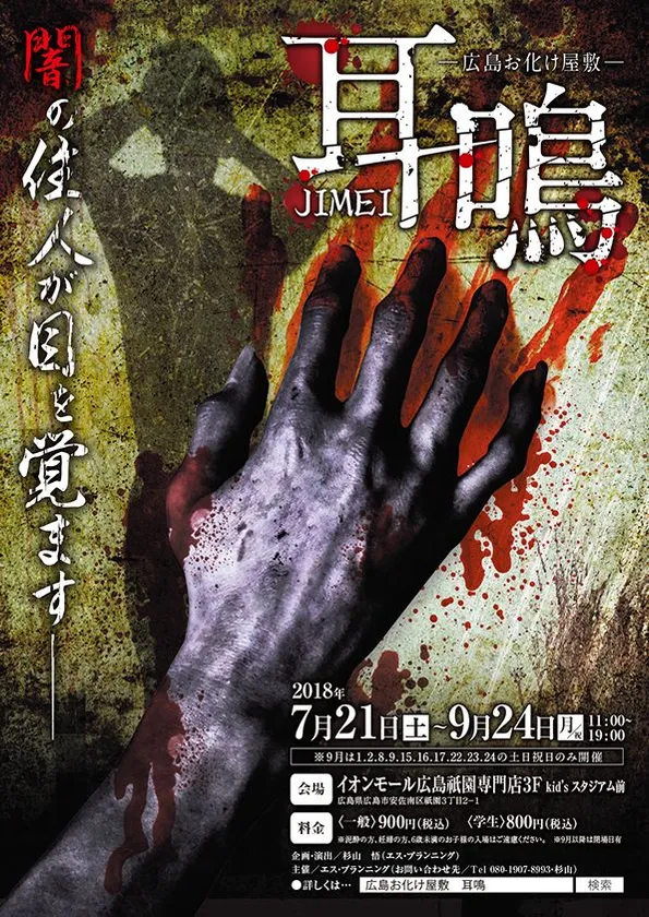 イベント企画 エス・プランニング(所在地:広島県広島市、代表:杉山 悟)は、2018年7月21日(土)~9月24日(月・祝)の期間中、「広島お化け屋敷耳鳴JIMEI」をイオンモール広島祇園で開催いたします。