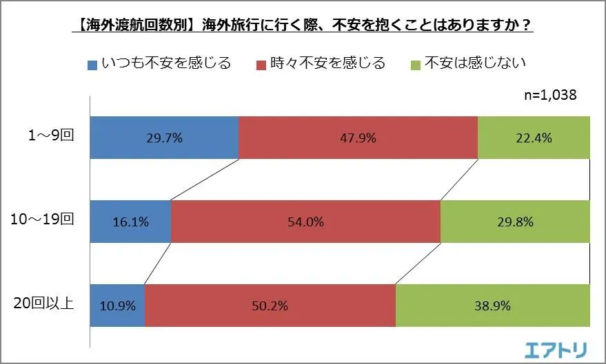 海外渡航回数別で見たところ、「いつも不安を感じる」「時々不安を感じる」と回答した人は海外渡航回数20回以上の人の場合約61.1%だったのに対し、10~19回の人は70.1%、1~9回の人は77.6%と渡航経験が少ない人ほど不安を感じやすいことが分かりました。