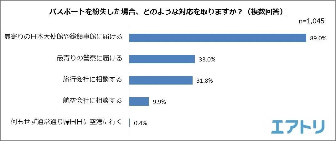 パスポートを紛失した場合の対処方法を聞いたところ、1位は「最寄りの日本大使館や総領事館に届ける」(89.0%)、続いて「最寄りの警察に届ける」(33.0%)、「旅行会社に相談する」(31.8%)と続きました。