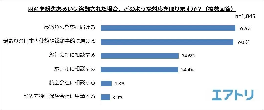 「最寄りの警察に届ける」(59.9%)、続いて「最寄りの日本大使館や総領事館に届ける」(59.0%)が過半数を占める一方で、「後日保険会社に申請する」と回答した人も3.9%いました。