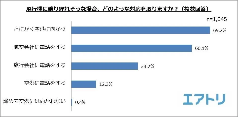 飛行機に乗り遅れそうな場合の対処方法について聞いたところ、1位は「とにかく空港に向かう」(69.2%)、続いて「航空会社に電話をする」(60.1%)、「旅行会社に相談する」(33.2%)と続きました。