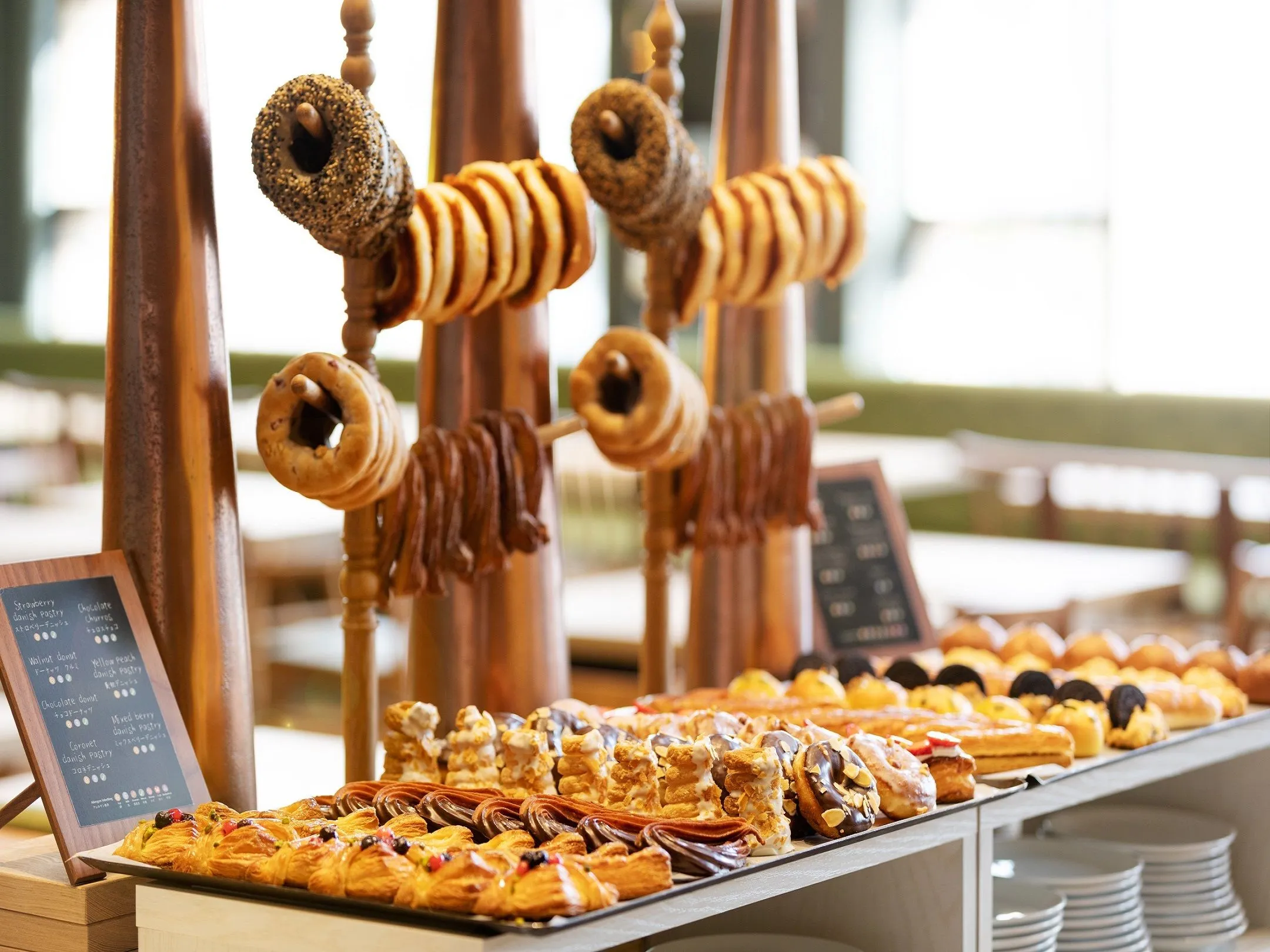 パンが20種類以上並ぶコーナーは圧巻です。パンのなる木にみなさん引き寄せられているのかなと推測しています。木に掛けてあるベーグルは飾りと思われてしまっているのでぜひ召し上がってみて欲しいです。