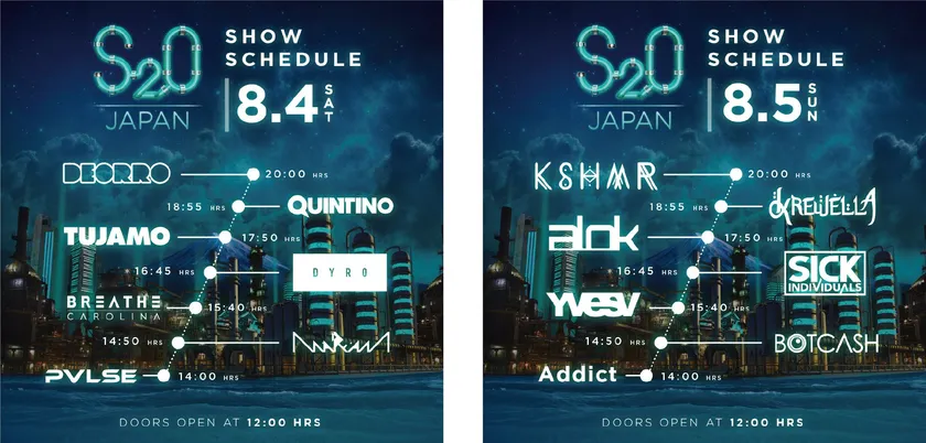 オープニングアクトにはS2O JAPAN GLOBAL AUDITION(エスツーオー・ジャパン・グローバル・オーディション)を勝ち抜いたDJ部門最優秀賞のADDICT(アディクト)と、特別賞に選ばれたPVLSE(パルス)、2番手には同オーディションのクリエーター部門最優秀賞のMAREAM(マリーム)とタイから来日するアーティストBOTCASH(ボットキャッシュ)が決定。そして、バラエティ豊かな海外のトップDJ達がS2Oといえば、の水と共にイベント終了時まで会場を盛り上げていきます。