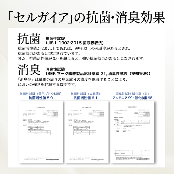 • 空気清浄機のような爽やかさ: フィルターに加え、抗菌・防臭・抗ウイルス効果のある「セルガイア」を使用。