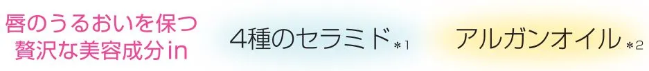 4種類のセラミド*1とアルガンオイル*2を贅沢に配合した濃厚バームが、唇の上でとろけて密着。ひと塗りで鮮やかな美発色を実現し、密着力にも優れているので美しい色とツヤが長時間持続します。唇のフォルムをきれいに見せるリッチなツヤ感は、ガサガサも縦ジワも目立たせません。