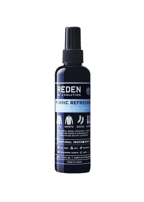 「REDEN FABRIC REFRESHER (リデン ファブリックリフレッシャー)」は、99.9%の除菌効果と消臭効果を併せ持ち、スーツをはじめとしたファブリックアイテムの除菌消臭を行いながら、ビジネスシーンを邪魔しない柑橘系を中心とした爽やかなブレンドのフレグランスがほのかに長時間香ります。除菌消臭しながら香水の役割も果たす、新感覚のファブリックケアアイテムです。