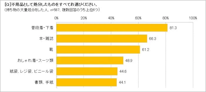 持ち物の大量処分をした人に、「不用品として処分したもの」の内訳を聞いたところ、1位が「普段着・下着」81.3%、2位が「本・雑誌」で66.3%、3位が「靴」で61.2%。処分した量に関しても豪快なエピソードが寄せられ、「結婚を期に、洋服を60kg処分しました!」(30代・パート)、「2年以上使わなかった鞄や洋服、日用品などを捨ててみたら、ゴミ袋16袋になった」(50代・派遣)など、捨てるからには徹底的に整理した人が目立ちました。