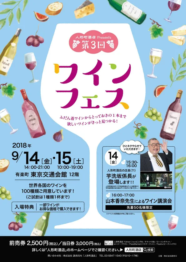 株式会社読売IS(本社:東京都中央区 代表取締役社長:工藤 博幸)は人形町酒店presents第3回『ワインフェス』を2018年9月14日(金)、15日(土)の2日間、東京交通会館にて開催いたします。