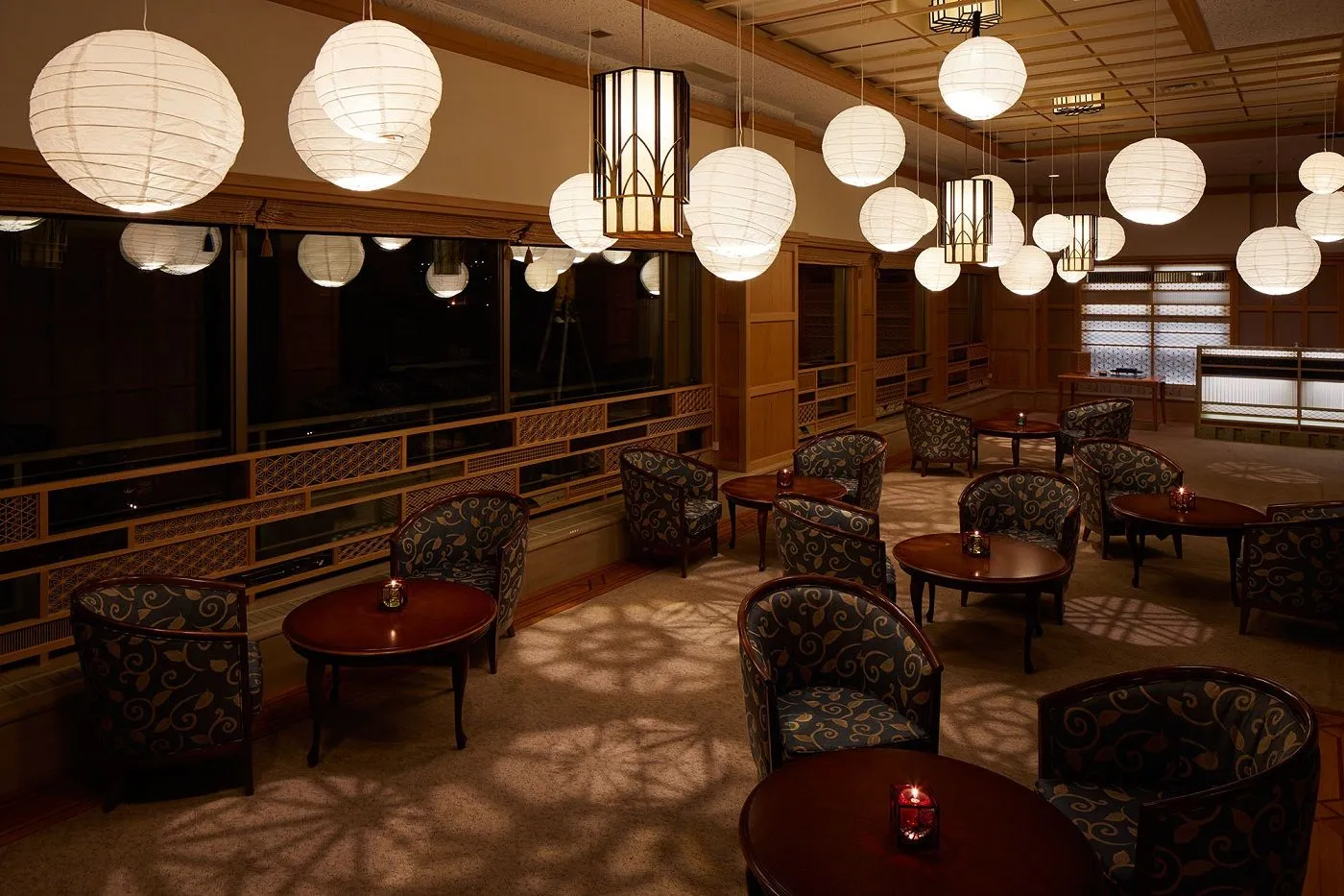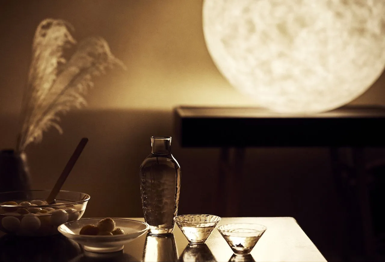 9月の夜、ロビー横のトラベルライブラリーに35種類の見立て月が登場します。栃木の伝統工芸品「新羽提灯(にっぱちょうちん)」と「鹿沼組子」の職人の技と遊び心を楽しむ秋の夜長を演出します。月に見立てた提灯の内側には江戸時代から受け継がれる木製の組子があしらわれており、35種の模様のシルエットが提灯の灯りに浮かび上がります。日光東照宮の建立が発祥の起源とされる鹿沼組子、日光詣の必需品だった提灯。そして、お月見のお供に用意する片山酒造のひやおろしは、日光東照宮にお神酒として奉納される地酒です。草月流の華道家が活けるすすきとともに、日光東照宮の繁栄の時代を感じながら江戸の職人技を楽しむお月見を提案します。