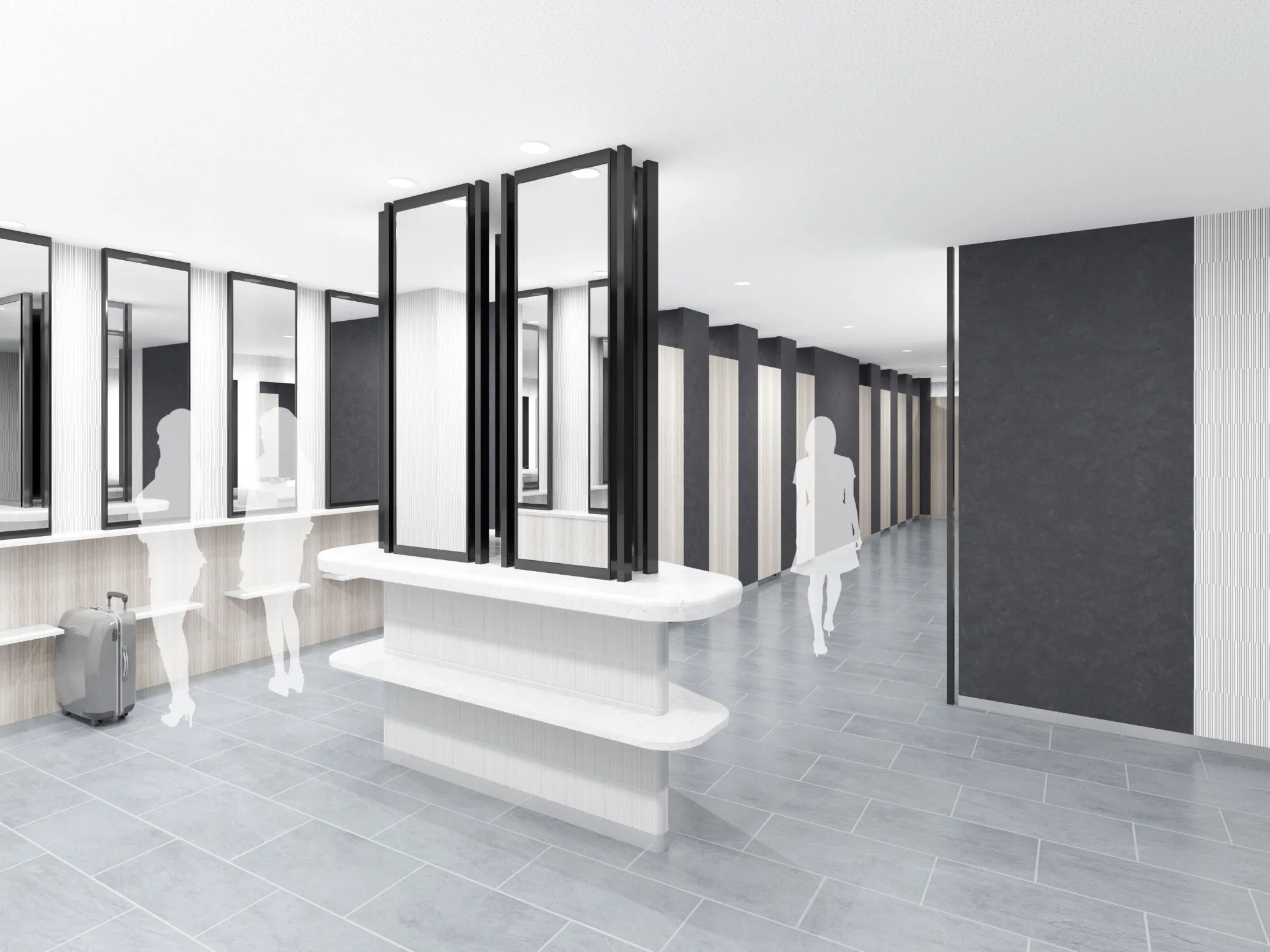 駅の東西2カ所にあるトイレを中央の1カ所に移転・統合いたします。同駅は、近鉄屈指のターミナル駅であり、大阪「ミナミ」の玄関口です。インバウンド観光客のご利用も多く、様々なお客さまの多様なニーズにお応えするべく、段差のない広々とした空間づくりやパウダーコーナーの大幅拡充をはじめとした整備を行うことで、大阪難波駅にふさわしい、お客さまにとって最も使いやすいトイレを目指します。