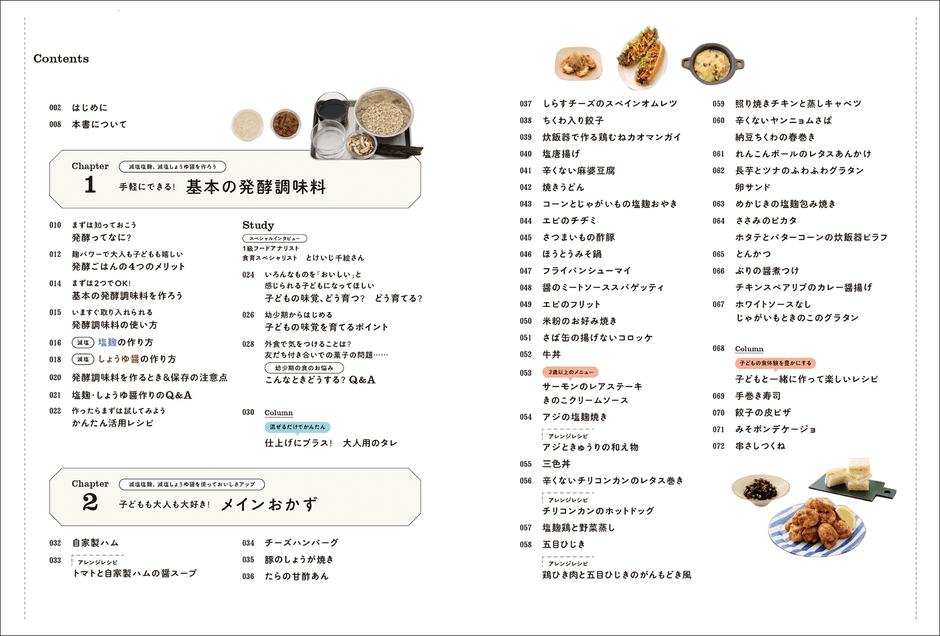 はじめに/本書について/Chapter1:手軽にできる!基本の発酵調味料/Chapter2:子どもの大人も大好き!メインおかず/Chapter3:素材のおいしさを楽しむ野菜の副菜おかず/Chapter4:ヘルシーでおいしい!お砂糖なしのおやつ/Chatpter5:さらに楽しむ発酵調味料/スペシャルインタビュー:とけいじ千絵