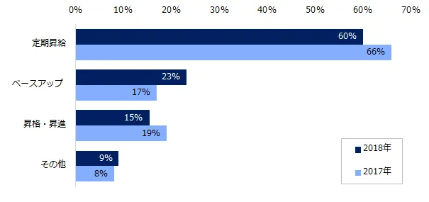 上がった理由について伺うと、もっとも多かったのは「定期昇給」(60%)。安倍政権が5年連続で要請している「ベースアップ」で月給が上がった方は23%でしたが、昨年(17%)に比べ増加しています。上昇額は「1001~3000円」(29%)が最多、次いで「3001~5000円」(20%)でした。
