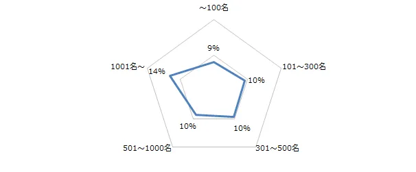 全回答者8,349名中、「今年に入ってからベースアップで月給が上がった」と回答した884名が在籍する企業の業種・規模を伺いました。今年ベースアップで月給が上がった方全体の平均値である11%よりも実施率が高い業種は「サービス(飲食・人材・教育など)」(17%)、「メーカー(機械・電気・電子など)」(14%)、「コンサルティング・士業」(13%)、「メーカー(素材・食品・医薬品など)」(12%)でした。企業規模では「1001名~」(14%)と規模が大きいほうが実施率が高いようです。