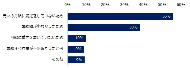 「モチベーションが上がらない、どちらとも言えない」と回答した方にその理由を質問すると、第1位は「元々の月給に満足をしていないため」(56%)、第2位は「昇給額が少なかったため」(38%)となりました。一方「モチベーションが上がった」と回答した方にその理由を質問すると、第1位は「自分が使えるお金が増えたため」(50%)、第2位は「会社から評価されていると感じたため」(46%)でした。それぞれのコメントもご紹介します。