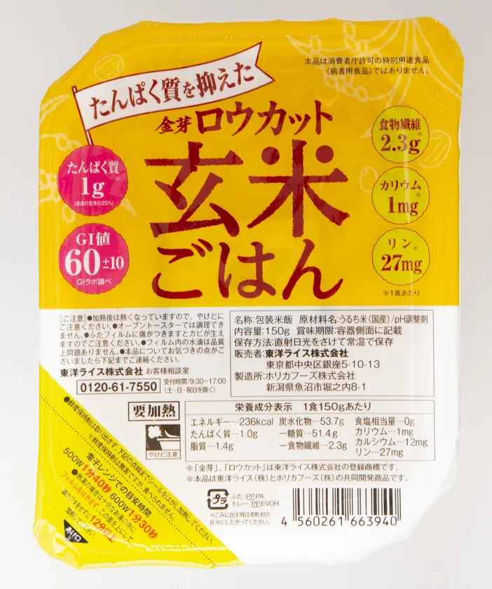 もっとも本商品は、東洋ライスの独自精製技術によって生まれた「金芽ロウカット玄米」を、低たんぱくご飯製造の先駆者であり、大手メーカーであるホリカフーズ株式会社(本社:新潟県魚沼市、代表取締役社長:川井 義博)の低たんぱく質化処理技術により、玄米のたんぱく質を減らすことに成功した商品で、玄米を原料として低たんぱく米化したコメ商品は市販品としては史上初となります。
