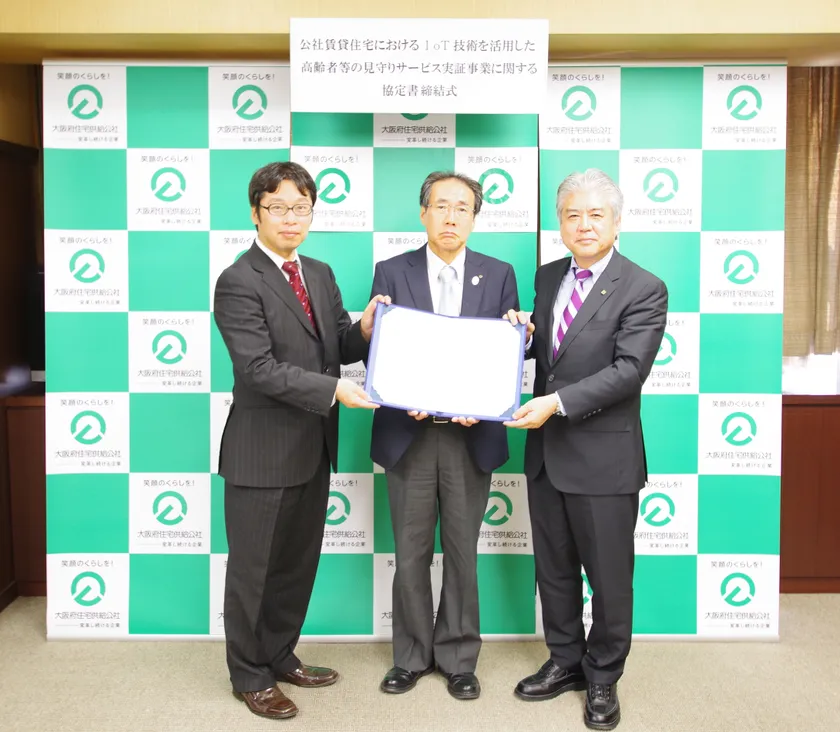 大阪府内で賃貸住宅の提供などの事業を行う大阪府住宅供給公社(本社:大阪市中央区、理事長:堤 勇二、以下 公社)は、ITベンチャー企業の株式会社VALUECARE(本社:東京都中野区、代表取締役:井出 清)、情報通信会社の京セラコミュニケーションシステム株式会社(本社:京都市伏見区、代表取締役社長:黒瀬 善仁)と、振動センサとIoTネットワーク「Sigfox」(※)を活用した、安価な高齢者見守りサービスの実証実験を相互に協力して行うことに関して協定を締結しました。