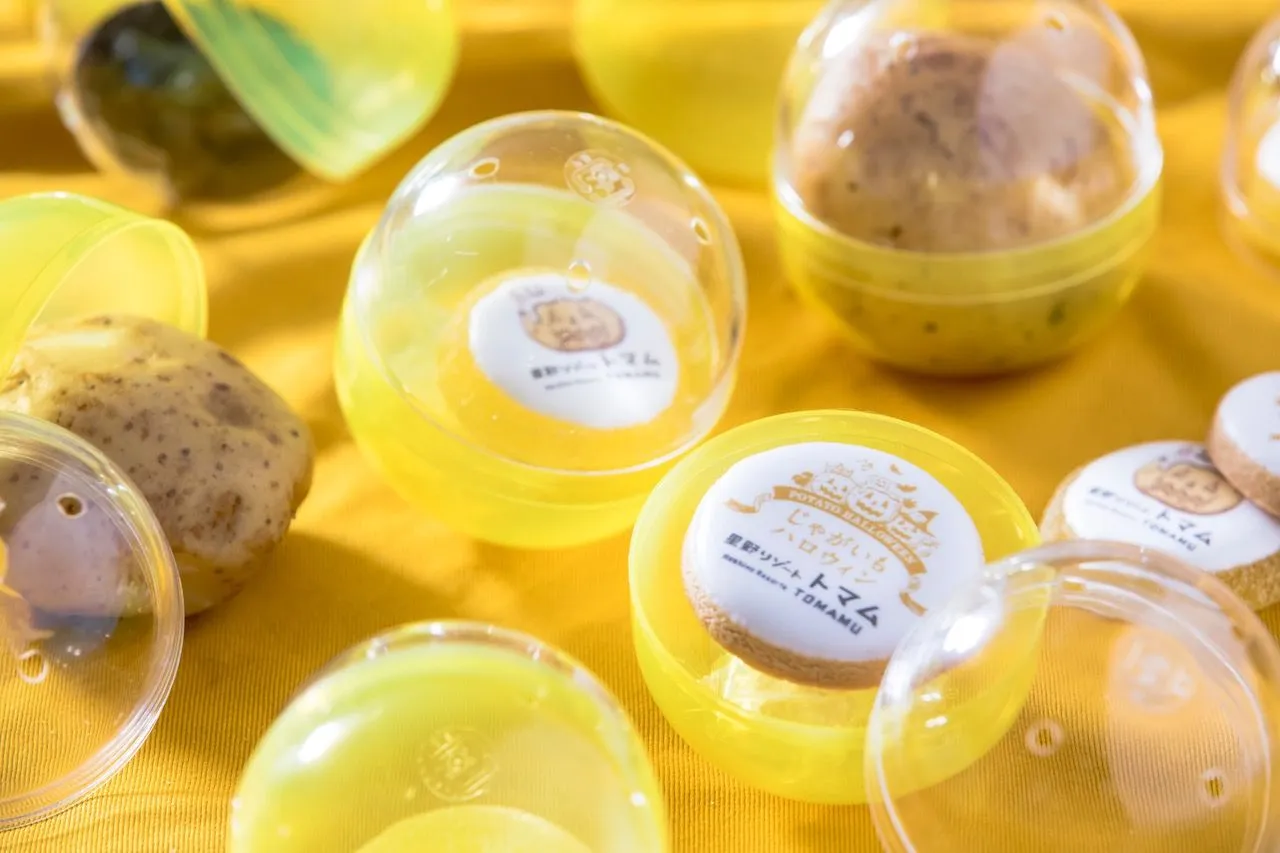 じゃがいもの「じゃが」という響きになぞらえて、「じゃがいもガジャガジャ」と名付けられたカプセルトイです。男爵芋のジャック・オ・ランタンがデザインされたクッキーやチョコレート、グミが入っています。更に、本物の男爵芋が入っているカプセルもあり、何が出てくるかはお楽しみです。