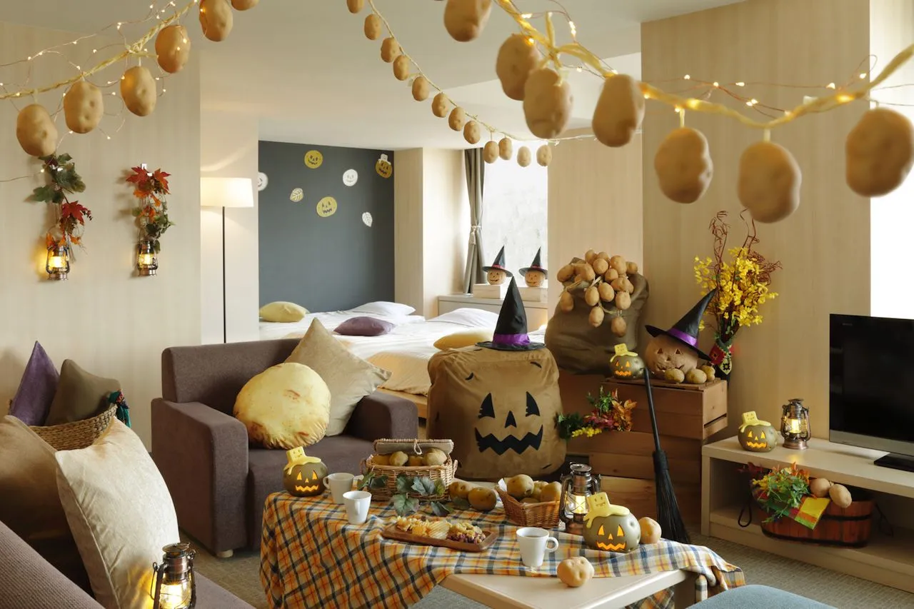 じゃがいもハロウィンをテーマに、じゃがいものクッションやオブジェが設えられた1室限定の客室です。じゃがいもジャック・オ・ランタンやじゃがいもクッション、じゃがいものレプリカ等の装飾が施されます。