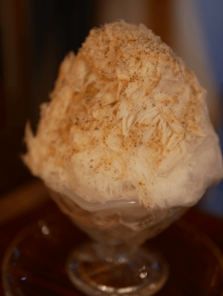 かき氷の中にはミックスナッツとグラノーラが入っており、チーズの塩味とブラックペッパーのバランスが取れたお味に加えて、ふわふわの氷の中にナッツやグラノーラのザクザク感も合わさって食感も楽しむことができます。