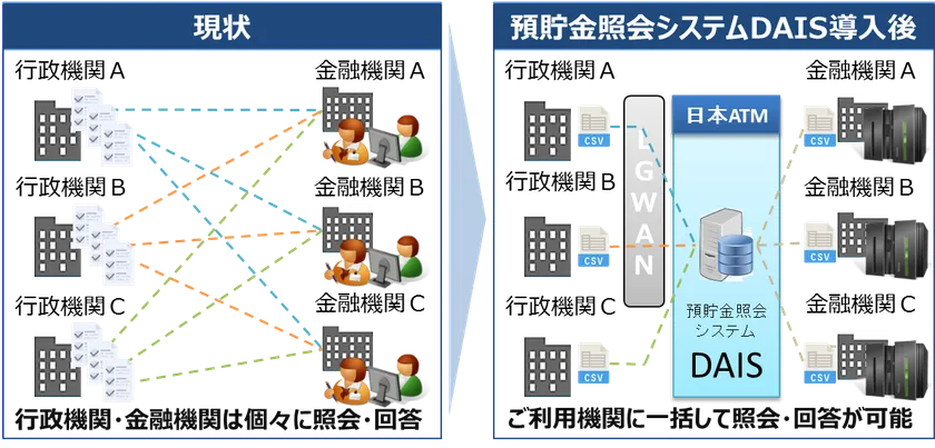 日本ATMは、長年に亘って培った金融機関業務のアウトソーシングや共同化の実績とノウハウを基にこの課題の解決に取り組んでおり、金融機関と行政機関が全国規模で共同利用できる預貯金照会システム(以下「DAIS(注1)」)の開発を進め、本年6月にLGWAN-ASPサービス(注2)として登録されました。本事業は全国の複数の地域の銀行と地方公共団体、及び関連システムベンダーの参画を得て、DAISを利用して本年7月から10月にかけて段階的に行われ、効果検証と課題の洗い出しを行うものです。日本ATMは本事業で得られた検証結果をDAISの開発に反映し、年内にサービスの提供を開始することを予定しています。