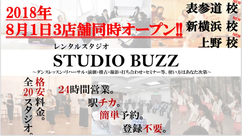 新たに同時オープンするSTUDIO BUZZの3店舗は、新横浜・表参道・上野とターミナル駅から直ぐの立地に、24時間格安でダンス以外でも多種多様に利用できるのが売りで、利用する人数や立地に合わせたレンタルが可能になります。