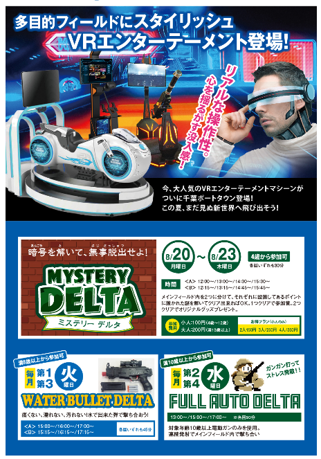 7月13日(金)からは、ポートタウン4階に、話題のスタイリッシュVRエンターテイメントが登場します。また同階にある劇場型アミューズメントフィールド「AIRSOFT ZONE DELTA」でも期間中様々な体験イベントを実施いたします。
