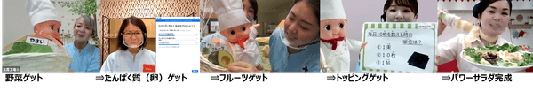キユーピーちゃんが各工場を旅して、クイズに答えてパワーサラダの材料をゲット! 全工場から集めた食材で、栄養バランスばっちりの美味しそうなパワーサラダが完成。