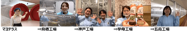 最初にマヨテラスからご挨拶、その後各工場からマヨネーズとドレッシングの製造工程を紹介しました。鳥栖工場はマヨネーズの大切な材料である卵を割る割卵機を説明し、神戸工場は実際にマヨネーズを作っているところをご案内。挙母工場からはキユーピー ドレッシングのラインアップを紹介し、五霞工場はドレッシングの製造工程をお話しました。