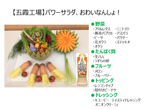 次回は海外の工場や普段は工場見学を行っていないところもお見せできればと思っています。引き続き「オンライン見学」で皆さんとお会いできることを心待ちにしています!「皆さんもパワーサラダ作ってみてください! 」工場メンバーより