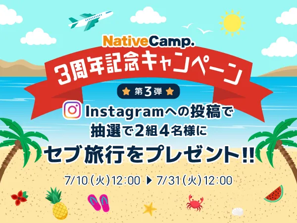 キャンペーン期間中にレッスン終了後に表示させる受講記録画面を指定のハッシュタグをつけてインスタグラムへ投稿 & ネイティブキャンプ公式インスタグラムをフォローしていただいた方の中から抽選で2組4名様に、セブ往復チケットをプレゼントいたします。