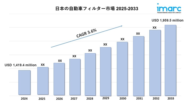 IMARCグループの最新の調査出版物「日本自動車用フィルター市場レポート:メディアタイプ別(セルロース、グラスファイバー、その他)、フィルタータイプ別(エアフィルター、燃料フィルター、油圧フィルター、オイルフィルター、ステアリングフィルター、クーラントフィルター、その他)、流通チャネル別(OEM、アフターマーケット)、車両タイプ別(商用車、乗用車、その他)、地域別 2025-2033年」によると、日本の自動車用フィルター市場規模は2024年に14億1,940万米ドルに達しました。今後、IMARCグループは、市場規模が2033年までに19億5,950万米ドルに達し、2025年から2033年の間に年平均成長率(CAGR)3.6%で成長すると予測しています。