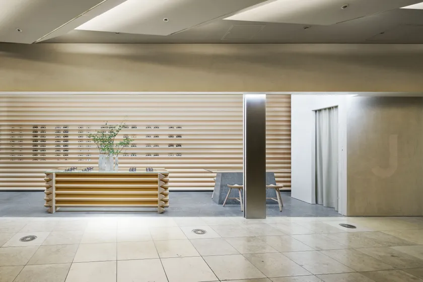 空間設計は「MOUNT FUJI ARCHITECTS STUDIO」が手がけ、釘を使わずに高度な技術で組み上げる檜の校倉(あぜくら)造りや左官仕上げの壁を取り入れた空間に仕上げました。凛とした佇まいでブランドコンセプトを体現しています。商品は、“贅沢なかけごこちの追求”を掲げ、J of JINS独自のラインアップを展開します。サービスにおいては、お客様一人ひとりのこだわりに応え、パーソナルな1本との出会いを提供することを重視。じっくりとお客様と対話ができる対面式カウンターでの接客や、鼻パッドのカスタマイズに対応するサービスなどを実施します。