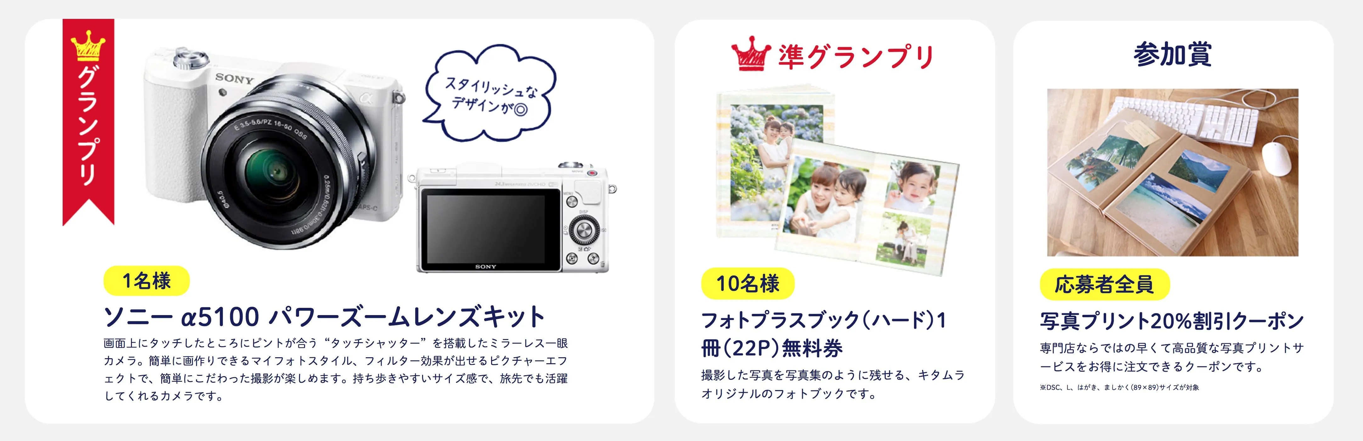 ご応募いただいた作品の中から、旅色プラス編集部・キタムラ審査員による審査を経て、グランプリ受賞者(1名様)、準グランプリ(10名様)を決定いたします。グランプリ受賞者には、もっと旅行での撮影を楽しんでもらいたいという思いから、簡単にこだわった撮影ができ、持ち歩きやすいサイズで、旅先でも活躍してくれるミラーレス一眼カメラ「ソニー α5100 パワーズームレンズキット」を贈呈。準グランプリ受賞者には、撮影した写真を写真集のように残せる、キタムラオリジナルのフォトブック無料券をプレゼントいたします。旅先の思い出をいつまでも手元に残してください。