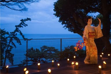 満月前後の晴れた月夜には、ご当地楽「熱海芸妓の舞」を青海テラスにて開催します。夜空に昇る月と相模湾に映るムーンロードという絶景のもとで、雅な芸妓の舞を鑑賞することができ、優雅で幻想的なひとときを過ごせます。