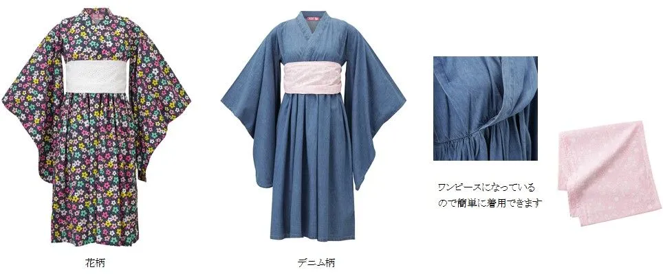 また、浴衣はガールズのみ展開。ワンピースになっており、被るだけで簡単に着れて、浴衣の着崩れの心配がいりません。帯を結ぶとスカート部分にギャザーが入り、可愛く着こなせます。