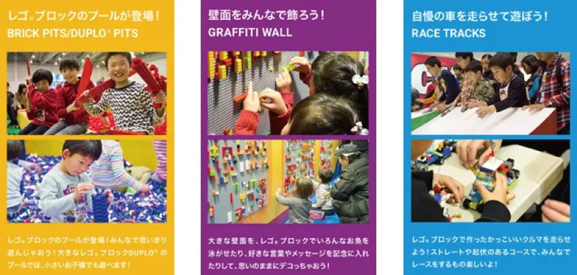 LEGO(R)ブロックを入れた最大タテ約5m×ヨコ約4mのまるでLEGO(R)ブロックのプールのような「ブリックピット」で遊んだり、自分で作ったクルマを走らせてレースができたり、自由に作ったタワーや家などの建築物を配置して巨大な地図を完成させることもできます。