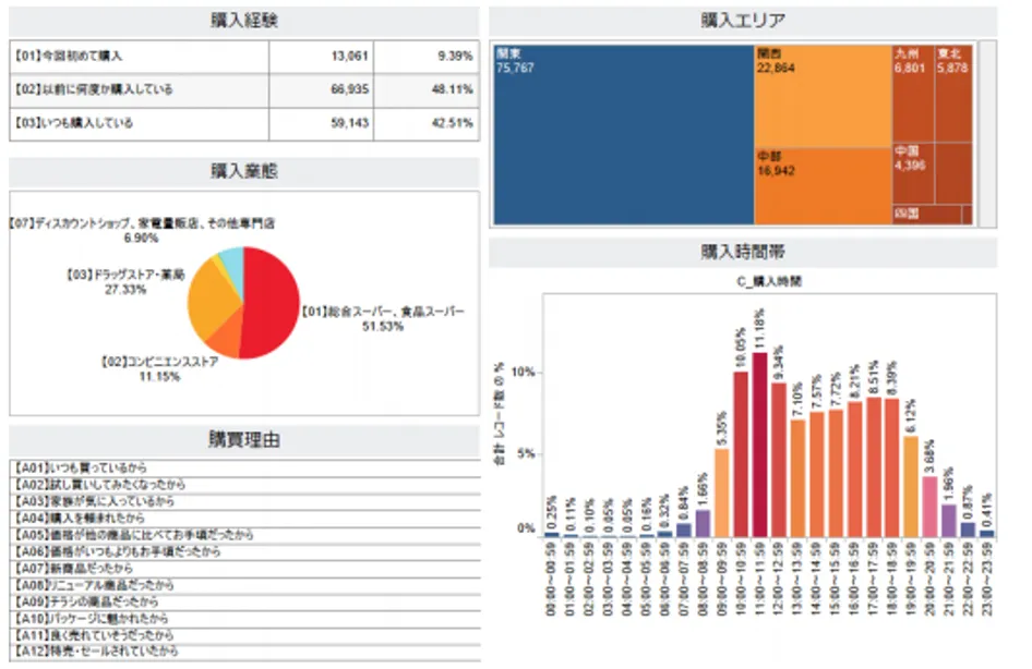 購入者の把握、購買トレンドの分析はもちろん、なぜその商品が購入され、購入されなかった原因は何であるのかなどPOSデータやID-POSデータよりも、付加価値のある他社とは差別化されたデータです。