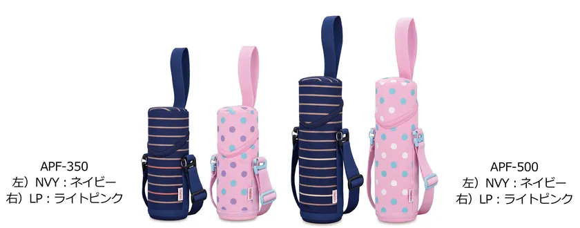 本製品は、持ち手とショルダーストラップがついたサーモス製真空断熱ボトル専用のポーチ。持ち手を使うとポーチフタを固定できるので、ボトルを入れたままでも飲むことができます。ショルダーストラップは取り外しが可能。ポーチと丈夫なソコでボトルの傷つきを防止します。カラーは男女ともに使いやすいストライプ柄のネイビーと、ドット柄が可愛いライトピンクの2色を展開。サイズによってドットやストライプの色が異なるので、ぜひ店頭でご確認ください。