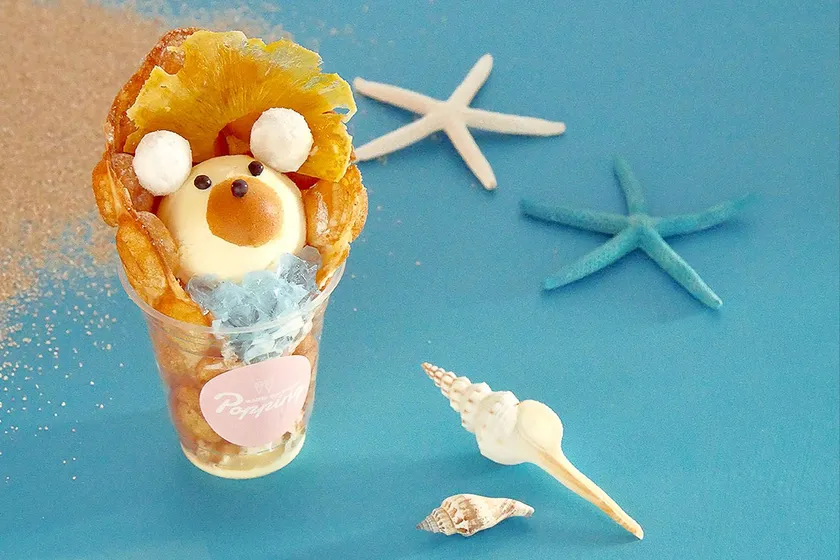 プカプカ海に浮かんだ白くまを表現した夏限定メニュー『白くまワッフル』の登場です。バニラ味の白くまの他に、ライム味のゼリーや甘酸っぱいドライパイナップルなど夏らしく爽やかな味が楽しめます。片手に持って食べ歩きができる、暑い夏にぴったりなひんやりスイーツです。