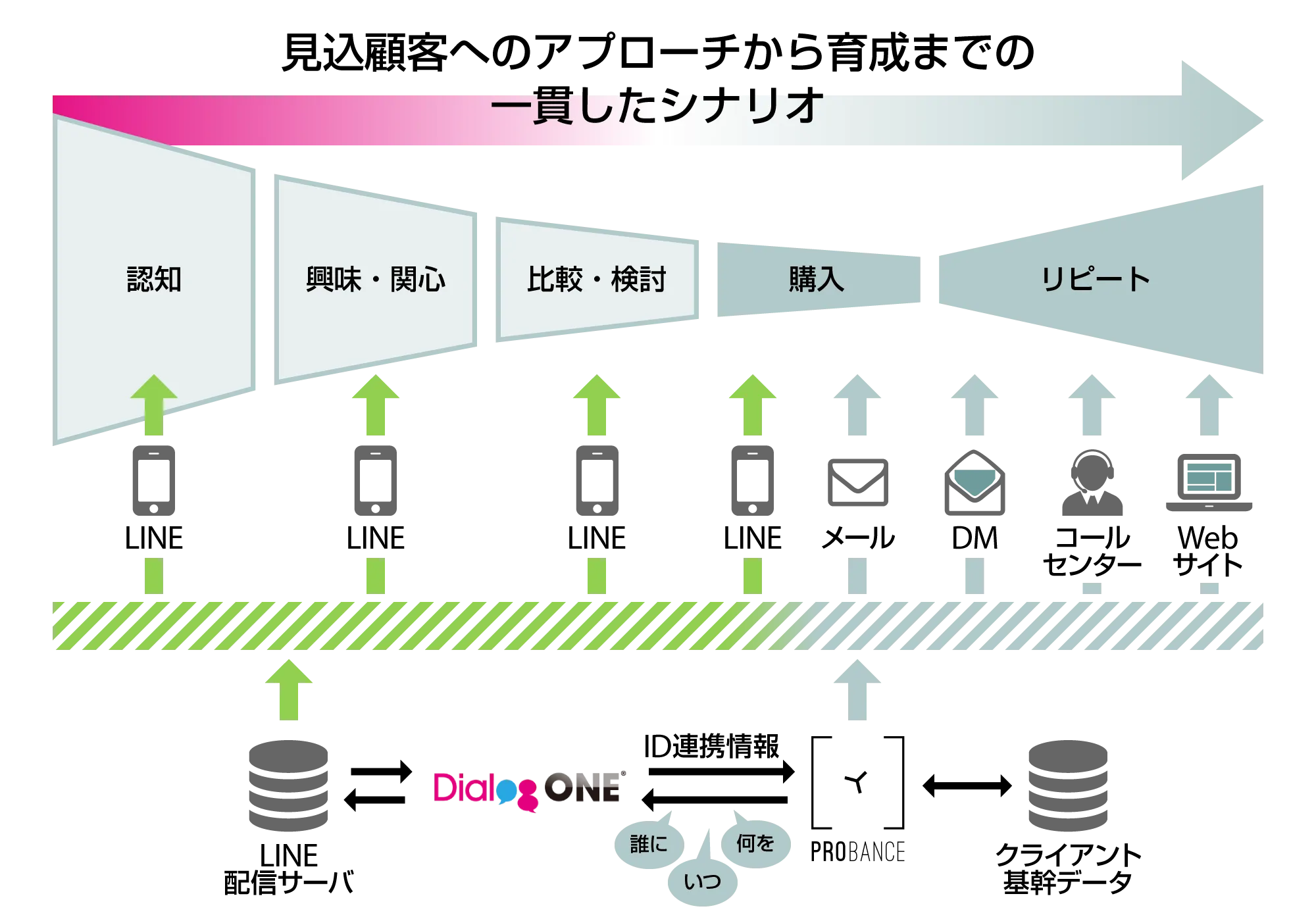 今回の連携により、会員登録済みの顧客への限定的なコミュニケーションだけでなく、LINE公式アカウントからの見込顧客(未会員)へのアプローチ範囲が格段に広がります。さらに、「誰に」「いつ」「何を」届けるかを「Probance」が判別し、その結果に基づき「DialogOne(R)」がメッセージを出し分けます。加えて、LINE IDと自社の会員IDを連携した顧客には、配信メッセージから遷移したWebサイト内の行動をトラッキングデータとして蓄積し、顧客とのコミュニケーションシナリオの出し分けにも反映することができます。