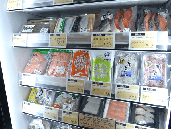 水産冷凍コーナーでは、食品添加物に配慮した商品や急速冷凍で鮮度が保たれる商品などを品ぞろえいたします。