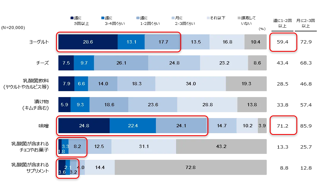・乳酸菌が含まれる食品摂取頻度として、週1-2回以上摂取されているのは「味噌」「ヨーグルト」が6~7割。