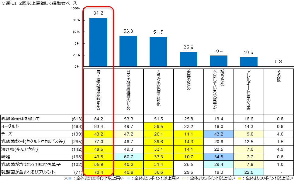 胃や腸内環境を整えるために意識して乳酸菌が含まれる食品を摂取しているが、明確に効果を感じている人は限定的という結果に。その理由として、乳酸菌の特徴やデメリット面、乳酸菌生産物質に関する内容理解が低い。これらの結果から、乳酸菌を摂取することが目的となっており、腸内環境を整えるための効果的な摂取が出来ていない可能性がある。