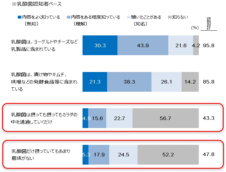 乳酸菌だけ摂っていてもあまり意味が無いことなどのデメリットに関する認知は5割未満。